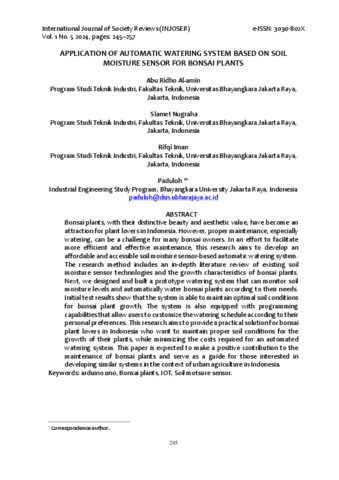 Abu Ridho Al-amin, Slamet Nugraha, Rifqi Iman, Paduloh (2024) APPLICATION OF AUTOMATIC WATERING SYSTEM BASED ON SOIL MOISTURE SENSOR FOR BONSAI PLANTS. INTERNATIONAL JOURNAL OF SOCIETY REVIEWS (INJOSER), 1 (5).
