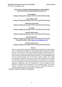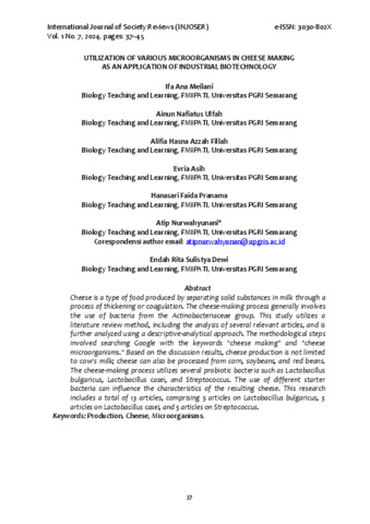 Ifa Ana Meilani, Ainun Nafiatus Ulfah, Alifia Hasna Azzah Fillah, Evria Asih, Han (2024) UTILIZATION OF VARIOUS MICROORGANISMS IN CHEESE MAKING AS AN APPLICATION OF INDUSTRIAL BIOTECHNOLOGY. INTERNATIONAL JOURNAL OF SOCIETY REVIEWS (INJOSER), 1 (7).