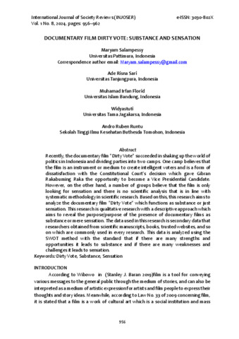 Maryam Salampessy, Ade Risna Sari, Muhamad Irfan Florid, Widyast, Andro Ruben Runtu (2024) DOCUMENTARY FILM DIRTY VOTE: SUBSTANCE AND SENSATION. INTERNATIONAL JOURNAL OF SOCIETY REVIEWS (INJOSER), 1 (8).