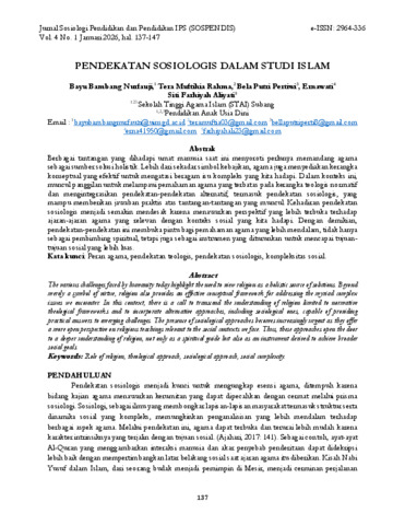 Bayu Bambang, Nurfauji and Tera Muftihia, Rahma and Bela Putri, Pertiwi and Ernawati, Ernawati and Siti Farhiyah, Aliyati (2026) PENDEKATAN SOSIOLOGIS DALAM STUDI ISLAM. Jurnal Sosiologi Pendidikan dan Pendidikan IPS (SOSPENDIS), 4 (1). ISSN 2964-336