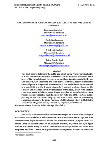 Riesta Ayu Oktarina, Daniel Andayawan, E Rizky Wulandari, Ratna Puspita Sari (2024) GANJAR PRANOWO'S POLITICAL IMAGE IN ELECTABILITY AS 2024 PRESIDENTIAL CANDIDATE. INTERNATIONAL JOURNAL OF SOCIETY REVIEWS (INJOSER), 1 (11).