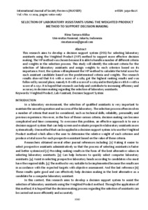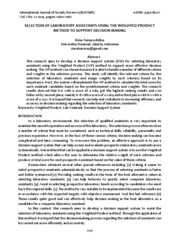 Rima Tamara, Aldisa (2024) SELECTION OF LABORATORY ASSISTANTS USING THE WEIGHTED PRODUCT METHOD TO SUPPORT DECISION MAKING. INTERNATIONAL JOURNAL OF SOCIETY REVIEWS (INJOSER), 1 (12).