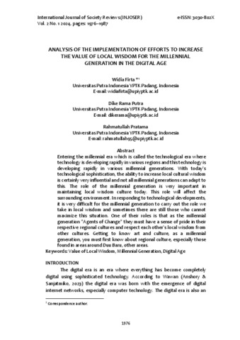 Widia Firta, Dike Rama Putra, Rahmatullah Pratama (2024) ANALYSIS OF THE IMPLEMENTATION OF EFFORTS TO INCREASE THE VALUE OF LOCAL WISDOM FOR THE MILLENNIAL GENERATION IN THE DIGITAL AGE. INTERNATIONAL JOURNAL OF SOCIETY REVIEWS (INJOSER), 2 (1).