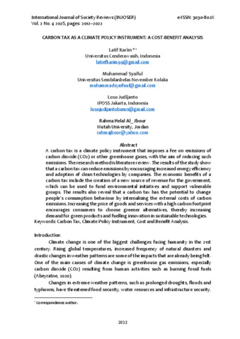 Latif Karim,Muhammad Syaiful, Loso Judijanto (2025) CARBON TAX AS A CLIMATE POLICY INSTRUMENT: A COST-BENEFIT ANALYSIS. INTERNATIONAL JOURNAL OF SOCIETY REVIEWS (INJOSER), 2 (4).