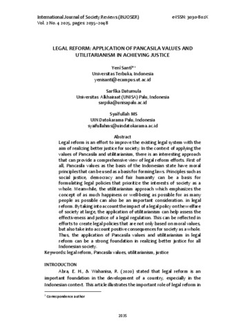 Yeni Santi, Sarfika Datumula, Syaifullah MS (2025) LEGAL REFORM: APPLICATION OF PANCASILA VALUES AND UTILITARIANISM IN ACHIEVING JUSTICE. INTERNATIONAL JOURNAL OF SOCIETY REVIEWS (INJOSER), 2 (4).