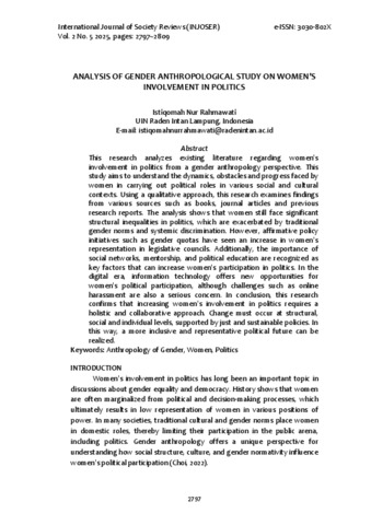 Istiqomah Nur, Rahmawati (2025) ANALYSIS OF GENDER ANTHROPOLOGICAL STUDY ON WOMEN'S INVOLVEMENT IN POLITICS. INTERNATIONAL JOURNAL OF SOCIETY REVIEWS (INJOSER), 2 (5).
