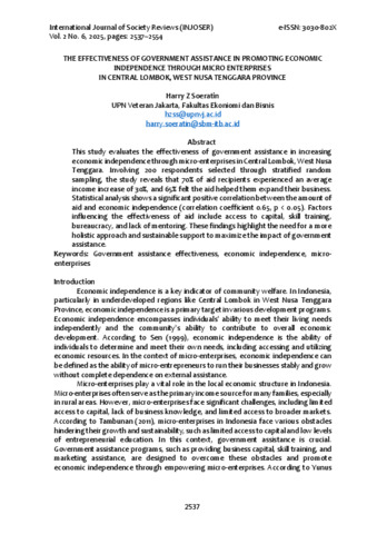 Harry Z, Soeratin (2025) THE EFFECTIVENESS OF GOVERNMENT ASSISTANCE IN PROMOTING ECONOMIC INDEPENDENCE THROUGH MICRO ENTERPRISESIN CENTRAL LOMBOK, WEST NUSA TENGGARA PROVINCE. INTERNATIONAL JOURNAL OF SOCIETY REVIEWS (INJOSER), 2 (6).
