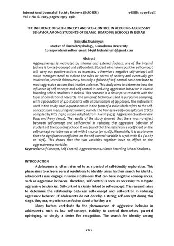 Bilqisthi, Zhahiriyah (2025) THE INFLUENCE OF SELF-CONCEPT AND SELF-CONTROL IN REDUCING AGGRESSIVE BEHAVIOR AMONG STUDENTS OF ISLAMIC BOARDING SCHOOLS IN BEKASI. INTERNATIONAL JOURNAL OF SOCIETY REVIEWS (INJOSER), 2 (6).