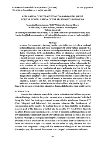 Sasangka Bhima, Asmara and Didit Widiatmoko, Soewardikoen and Hanif, Azhar and Yanuar, Rahman and Andreas Rio, Adriyanto APPLICATION OF INTERACTIVE MEDIA AND DIGITAL MEDIA FOR THE REVITALIZATION OF THE MUSEUM POS INDONESIA. INTERNATIONAL JOURNAL OF SOCIETY REVIEWS (INJOSER), 3 (2).