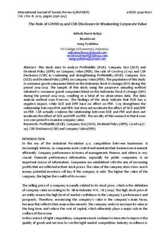 Adinda Nurul Auliya, Reschiwati, Aang Syahdina (2025) The Role of COVID-19 and CSR Disclosure in Weakening Corporate Value. INTERNATIONAL JOURNAL OF SOCIETY REVIEWS (INJOSER), 2 (8).