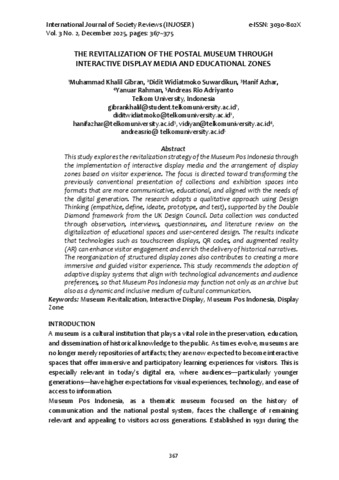 Muhammad Khalil, Gibran and Didit Widiatmoko, Suwardikun and Hanif, Azhar and Yanuar, Rahman and Andreas Rio, Adriyanto THE REVITALIZATION OF THE POSTAL MUSEUM THROUGH INTERACTIVE DISPLAY MEDIA AND EDUCATIONAL ZONES. INTERNATIONAL JOURNAL OF SOCIETY REVIEWS (INJOSER), 3 (2).