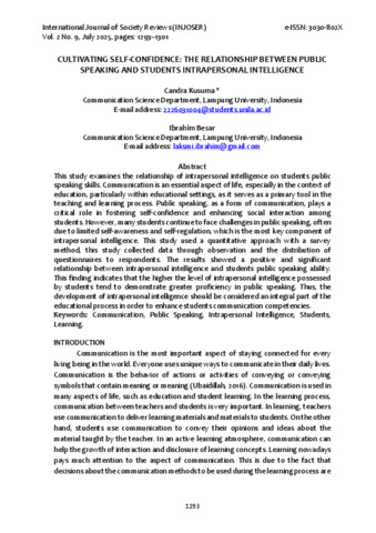 Candra Kusuma, Ibrahim Besar (2025) CULTIVATING SELF-CONFIDENCE: THE RELATIONSHIP BETWEEN PUBLIC SPEAKING AND STUDENTS INTRAPERSONAL INTELLIGENCE. Injoser, 2 (9).