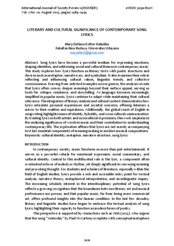 Mary Deliana Esther, Dabukke (2025) LITERARY AND CULTURAL SIGNIFICANCE OF CONTEMPORARY SONG LYRICS. Injoser, 2 (10).