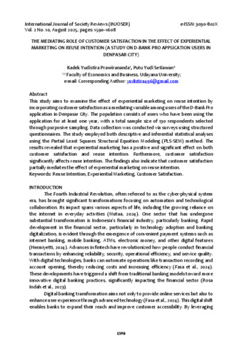 Kadek Yudistira Prawirananda, Putu Yudi Setiawan (2025) THE MEDIATING ROLE OF CUSTOMER SATISFACTION IN THE EFFECT OF EXPERIENTIAL MARKETING ON REUSE INTENTION (A STUDY ON D-BANK PRO APPLICATION USERS IN DENPASAR CITY). Injoser, 2 (10).