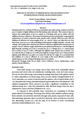 Rocky Torang Silaban, Joko Setiyono (2025) ANALYSIS OF THE EFFECT OF MIRROR REFLECTORS ON POWER OUTPUT OPTIMIZATION IN FLOATING SOLAR POWER PLANTS. Injoser, 2 (11).