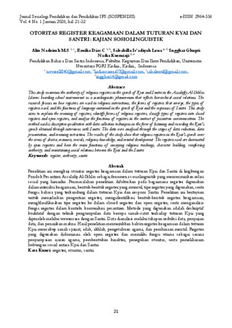 Alin Nadziroh, M.S and Emilia, Dias C and Salsabilla Is’adiyah, Lena and Ingghar Ghupti Nadia, Kusmiaji (2026) OTORITAS REGISTER KEAGAMAAN DALAM TUTURAN KYAI DAN SANTRI: KAJIAN SOSIOLINGUISTIK. Jurnal Sosiologi Pendidikan dan Pendidikan IPS (SOSPENDIS), 4 (1). ISSN 2964-336