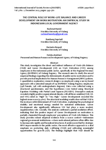 Rachmat, Hamid and Bambang, Supriadi and Harianto, Respati and Feriska, Andriani THE CENTRAL ROLE OF WORK–LIFE BALANCE AND CAREER DEVELOPMENT ON WORK MOTIVATION: AN EMPIRICAL STUDY IN INDONESIAN LOCAL GOVERNMENT AGENCY. INTERNATIONAL JOURNAL OF SOCIETY REVIEWS (INJOSER), 3 (2).