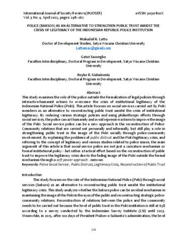 Makudali K. Lattu, Gatot Sasongko, Royke R. Siahainenia (2025) POLICE (BAKSOS) AS AN ALTERNATIVE TO STRENGTHEN PUBLIC TRUST AMIDST THE CRISIS OF LEGITIMACY OF THE INDONESIAN REPUBLIC POLICE INSTITUTION. Injoser, 3 (4).