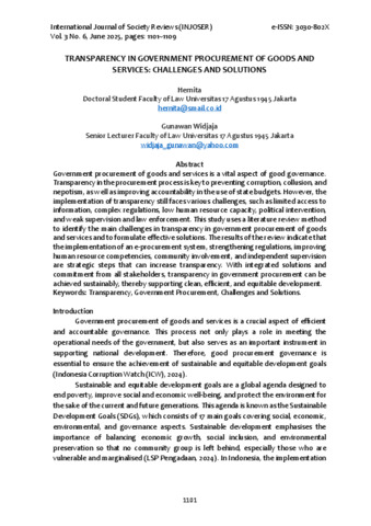 Hernita, Gunawan Widjaja (2025) TRANSPARENCY IN GOVERNMENT PROCUREMENT OF GOODS AND SERVICES: CHALLENGES AND SOLUTIONS. Injoser, 3 (6).