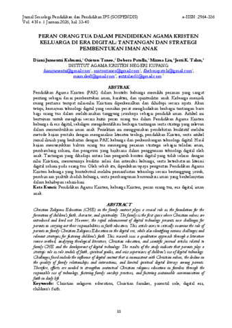 Diani Jumentri, Kabnani and Oriston, Taneo and Debora, Patolla and Mirma, Liu and Jerti K., Talan (2026) PERAN ORANG TUA DALAM PENDIDIKAN AGAMA KRISTEN KELUARGA DI ERA DIGITAL: TANTANGAN DAN STRATEGI PEMBENTUKAN IMAN ANAK. Jurnal Sosiologi Pendidikan dan Pendidikan IPS (SOSPENDIS), 4 (1). ISSN 2964-336