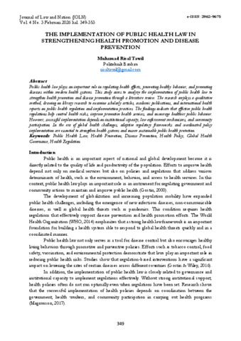 Muhamad Risal, Tawil (2026) THE IMPLEMENTATION OF PUBLIC HEALTH LAW IN STRENGTHENING HEALTH PROMOTION AND DISEASE PREVENTION. Journal of Law and Nation.