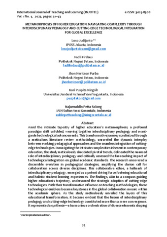 Loso Judijanto, Fadli Firdaus, Jhon Hericson Purba, Kori Puspita, Najamuddin Petta Solong (2023) METAMORPHOSIS OF HIGHER EDUCATION: NAVIGATING COMPLEXITY THROUGHINTERDISCIPLINARY PEDAGOGY AND CUTTING-EDGE TECHNOLOGICAL INTEGRATION FOR GLOBAL EXCELLENCE. International Journal of Teaching and Learning (INJOTEL), 1 (4).