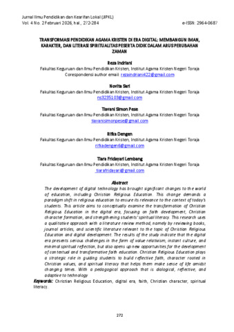 Reza Indriani, Novita Sari, Tiavani Simon Pese, Rifka Dengen, Tiara Fridayari Lembang (2026) TRANSFORMASI PENDIDIKAN AGAMA KRISTEN DI ERA DIGITAL: MEMBANGUN IMAN, KARAKTER, DAN LITERASI SPIRITUALITAS PESERTA DIDIK DALAM ARUS PERUBAHAN ZAMAN. Jurnal Ilmu Pendidikan dan Kearifan Lokal (JIPKL), 4 (2).