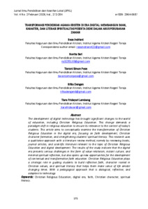 The development of digital technology has brought significant changes to the world of education, including Christian Religious Education. This change demands a paradigm shift in religious education to ensure its relevance to the context of today's students. This article aims to conceptually examine the transformation of Christian Religious Education in the digital era, focusing on faith development, Christian character formation, and strengthening students' spiritual literacy. This research uses a qualitative approach with a literature review method, namely by reviewing books, journal articles, and scientific literature relevant to the topic of Christian Religious Education and digital development. The results of the study indicate that the digital era presents serious challenges in the form of value relativism, instant culture, and minimal spiritual reflection, but also opens up new opportunities for the development of contextual and transformative faith education. Christian Religious Education plays a strategic role in guiding students to build reflective faith, character rooted in Christian values, and spiritual literacy that helps them make sense of life amidst changing times. With a pedagogical approach that is dialogical, reflective, and adaptive to technology.