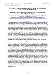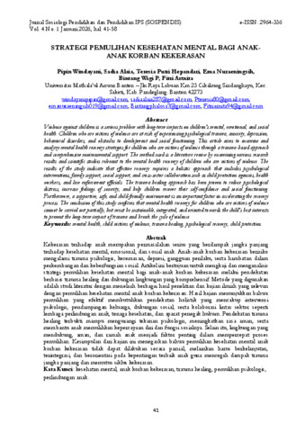 Sadia, Alaia and Teresia, Putri Hepandari and Ema, Nuraeningsih and Bintang, Wigi P and Fitri, Artnita (2026) STRATEGI PEMULIHAN KESEHATAN MENTAL BAGI ANAK-ANAK KORBAN KEKERASAN. Jurnal Sosiologi Pendidikan dan Pendidikan IPS (SOSPENDIS), 4 (1). ISSN 2964-336