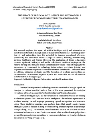 Loso, Judijanto (2023) THE IMPACT OF ARTIFICIAL INTELLIGENCE AND AUTOMATION: A LITERATURE REVIEW ON INDUSTRIAL TRANSFORMATION. INTERNATIONAL JOURNAL OF SOCIETY REVIEWS (INJOSER), 1 (1).