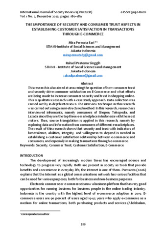 Mira Permata Sari, Rahadi Pratomo Singgih (2023) THE IMPORTANCE OF SECURITY AND CONSUMER TRUST ASPECTS IN ESTABLISHING CUSTOMER SATISFACTION IN TRANSACTIONS THROUGH E-COMMERCE. INTERNATIONAL JOURNAL OF SOCIETY REVIEWS (INJOSER), 1 (2).
